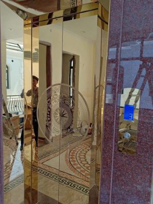 - Vách kính có màu vàng sang trọng được đánh giá là màu sắc hoàng gia, đảm bảo có thể thích hợp với nhiều không gian nội thất, kiến trúc, đặc biệt là thiết kế biệt thự cổ điển cao cấp. Chính vì thế vách gương cabin thang máy máy vàng được nhiều người chọn.